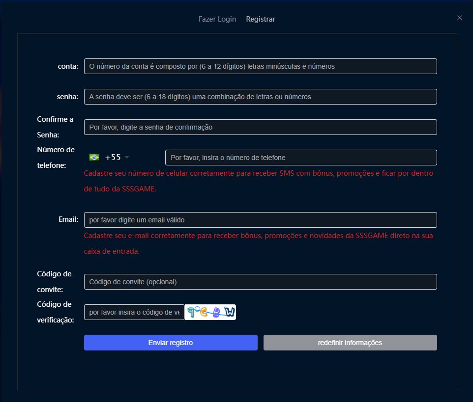 Em algumas versões do site, a opção de SSSGAME login e cadastro aparecem juntas; clique em “Cadastrar-se” para novos usuários